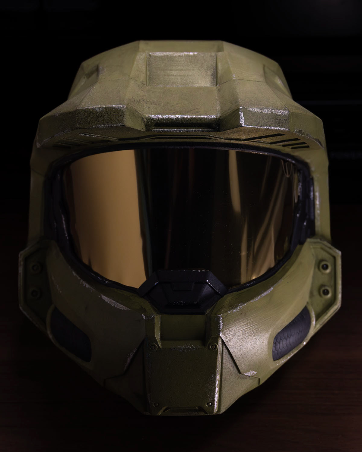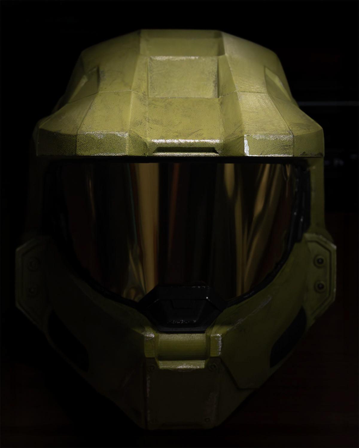 This is a model of the Master Chief helmet from Halo Infinite. The files are from Galactic Armory, and the helmet prints in four main pieces. The visor is a transparent metallic gold sheet found on Amazon. It includes four LEDs controlled by a switch inside of the helmet and a weathered paint job. The paints used are Rustoleum Satin Eden, Behr Matte Black, Rustoleum Metallic Silver, and a simple black hand paint.