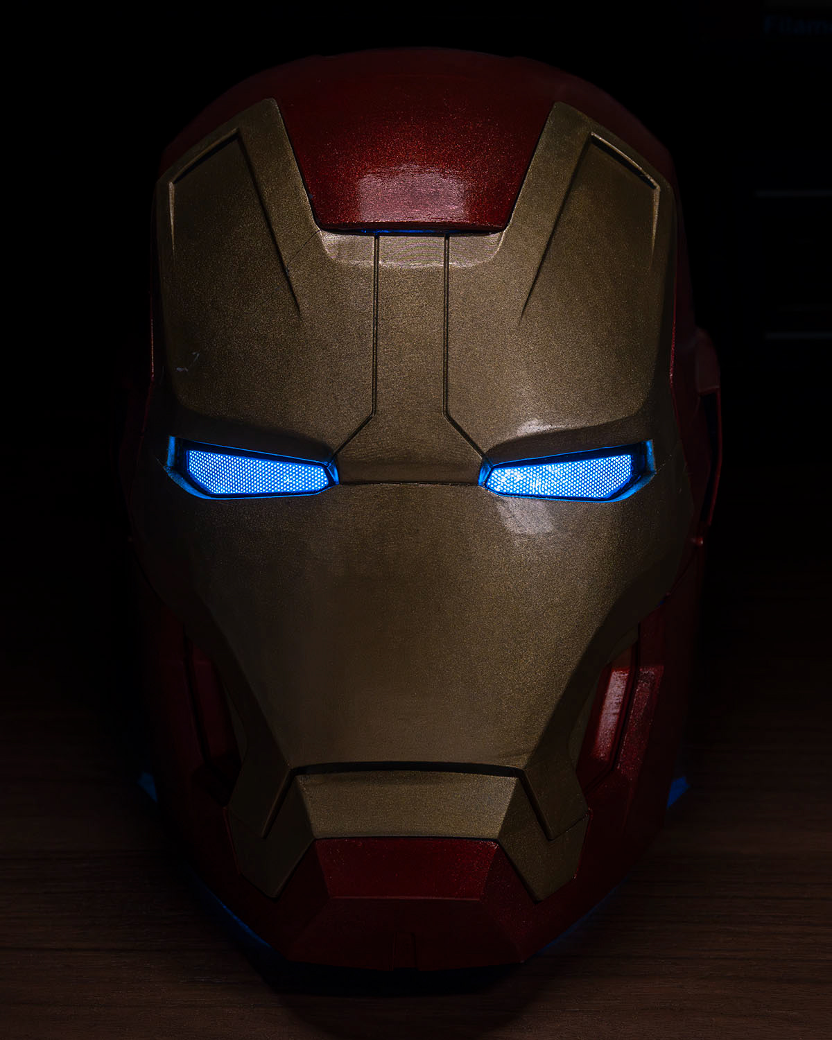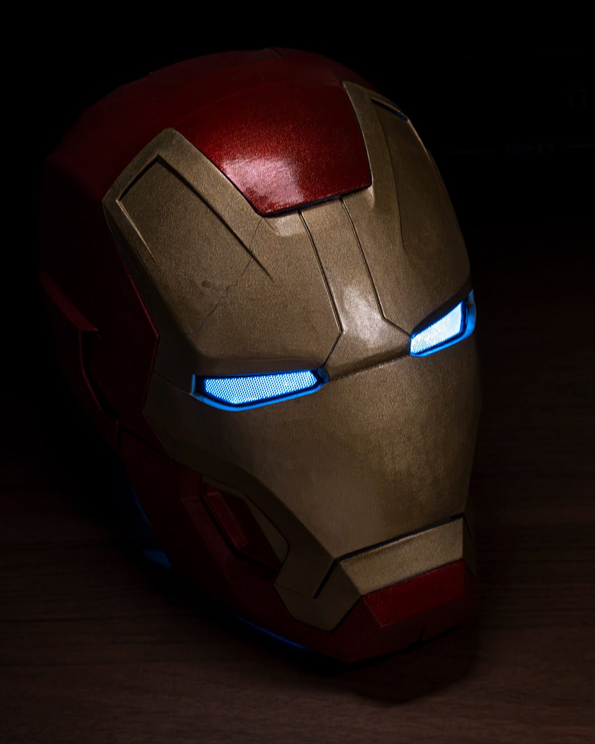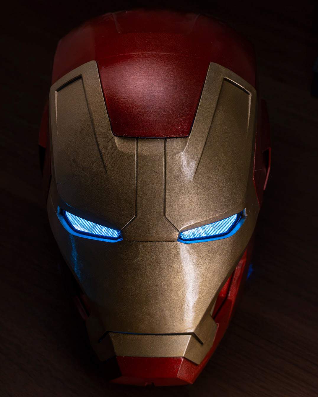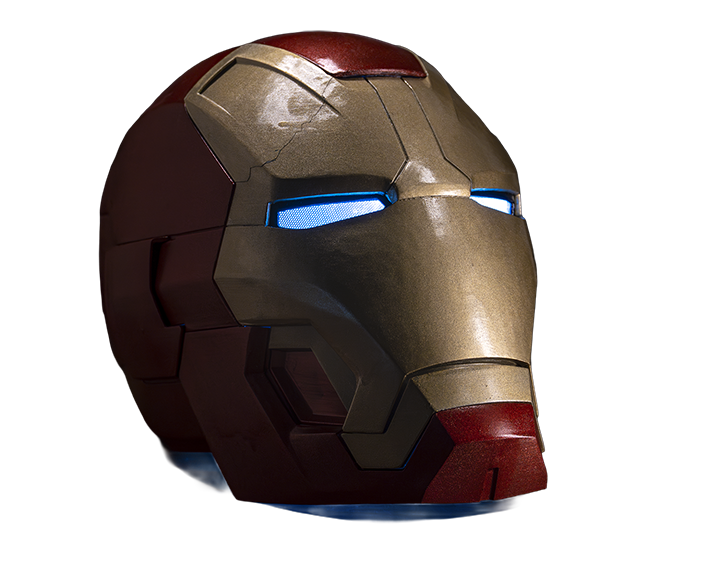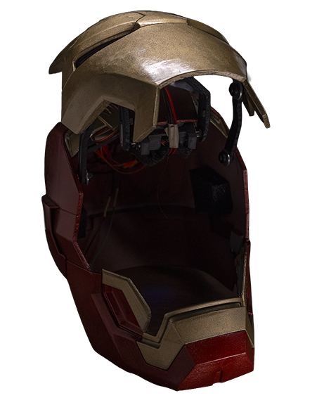 This is a model of the Mk 42 Iron man helmet, seen in Iron Man 3. It is fully wearable, with foam inserts inside to help the helmet fit snugly on ones head. The spray paints used are BEHR Metallic Red Gloss, BEHR Metallic Gold Gloss, with a final Rustoleum clear coat to achieve an accurate color and finish. The helmet uses an Arduino Nano micro controller, two MG90 servos, a pushbutton, led eyes, and a portable charger to power the circuit. The led eyes are specifically for Iron Man which can be found on many online stores.