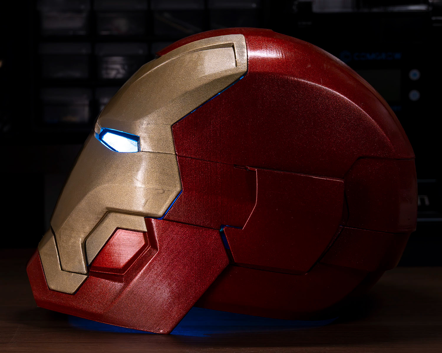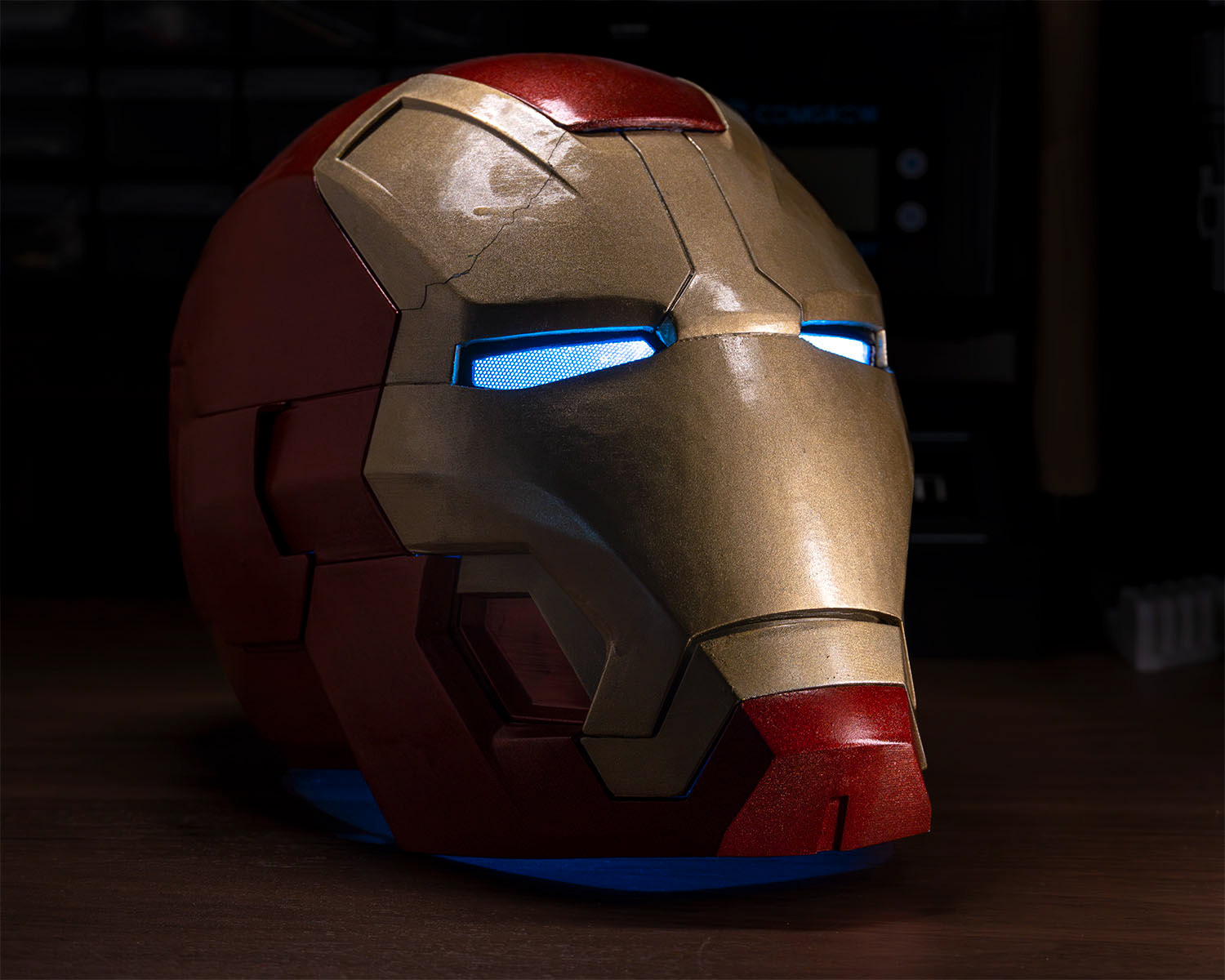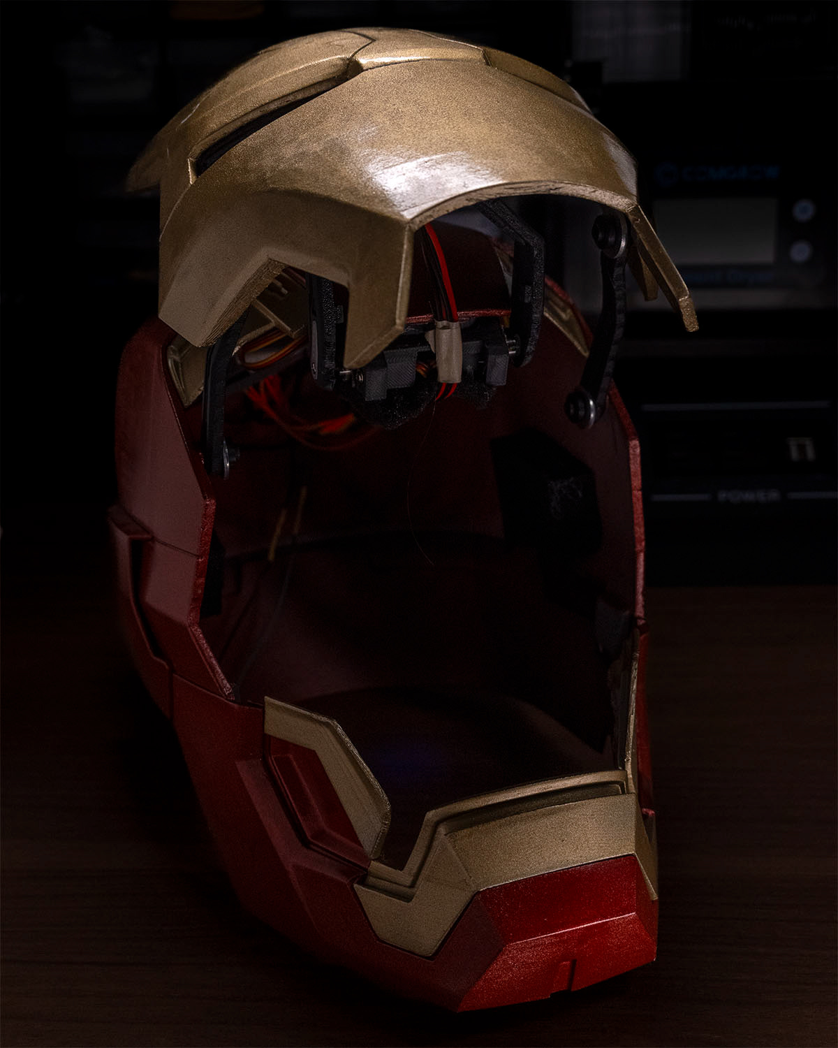 This is a model of the Mk 42 Iron man helmet, seen in Iron Man 3. It is fully wearable, with foam inserts inside to help the helmet fit snugly on ones head. The spray paints used are BEHR Metallic Red Gloss, BEHR Metallic Gold Gloss, with a final Rustoleum clear coat to achieve an accurate color and finish. The helmet uses an Arduino Nano micro controller, two MG90 servos, a pushbutton, led eyes, and a portable charger to power the circuit. The led eyes are specifically for Iron Man which can be found on many online stores.