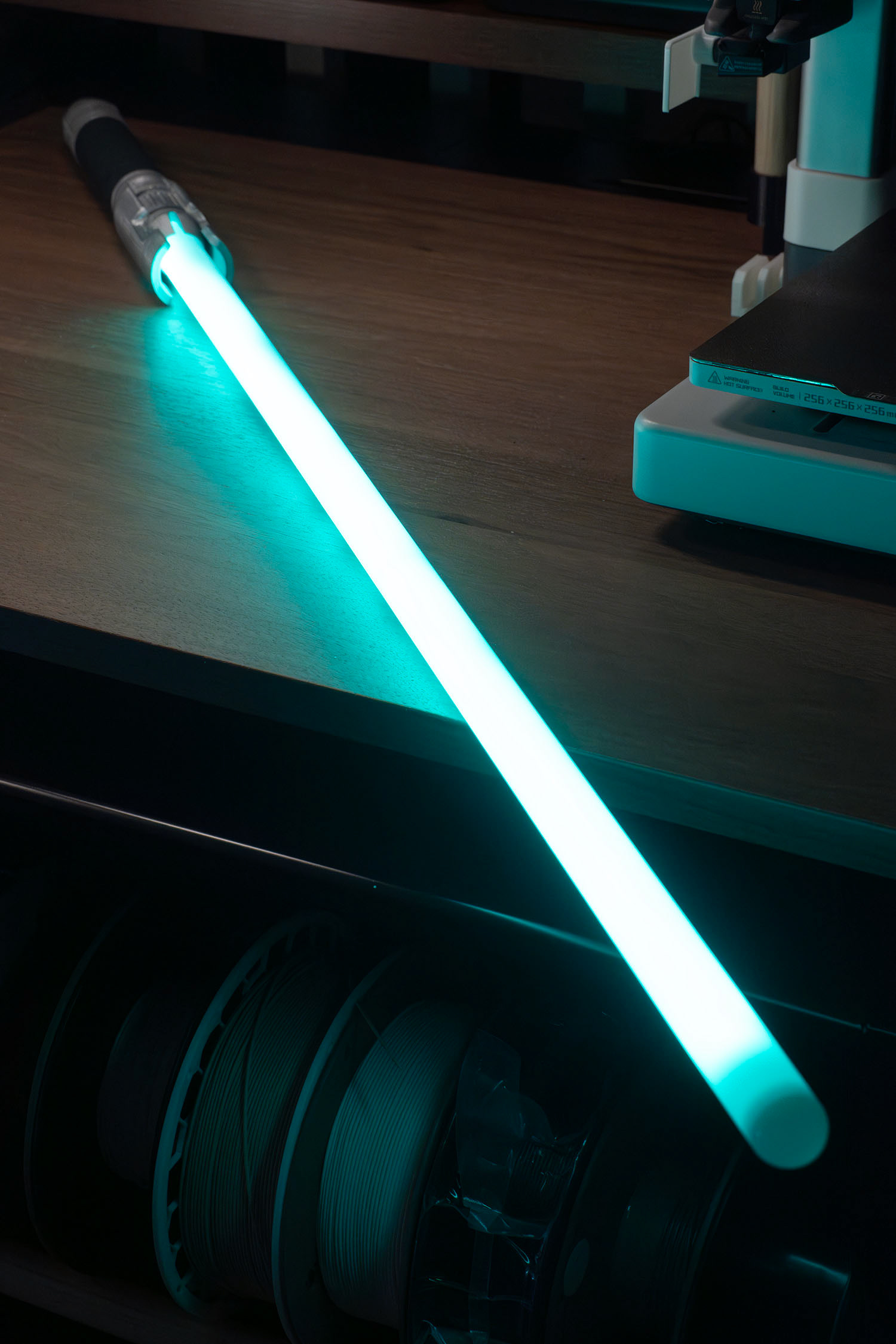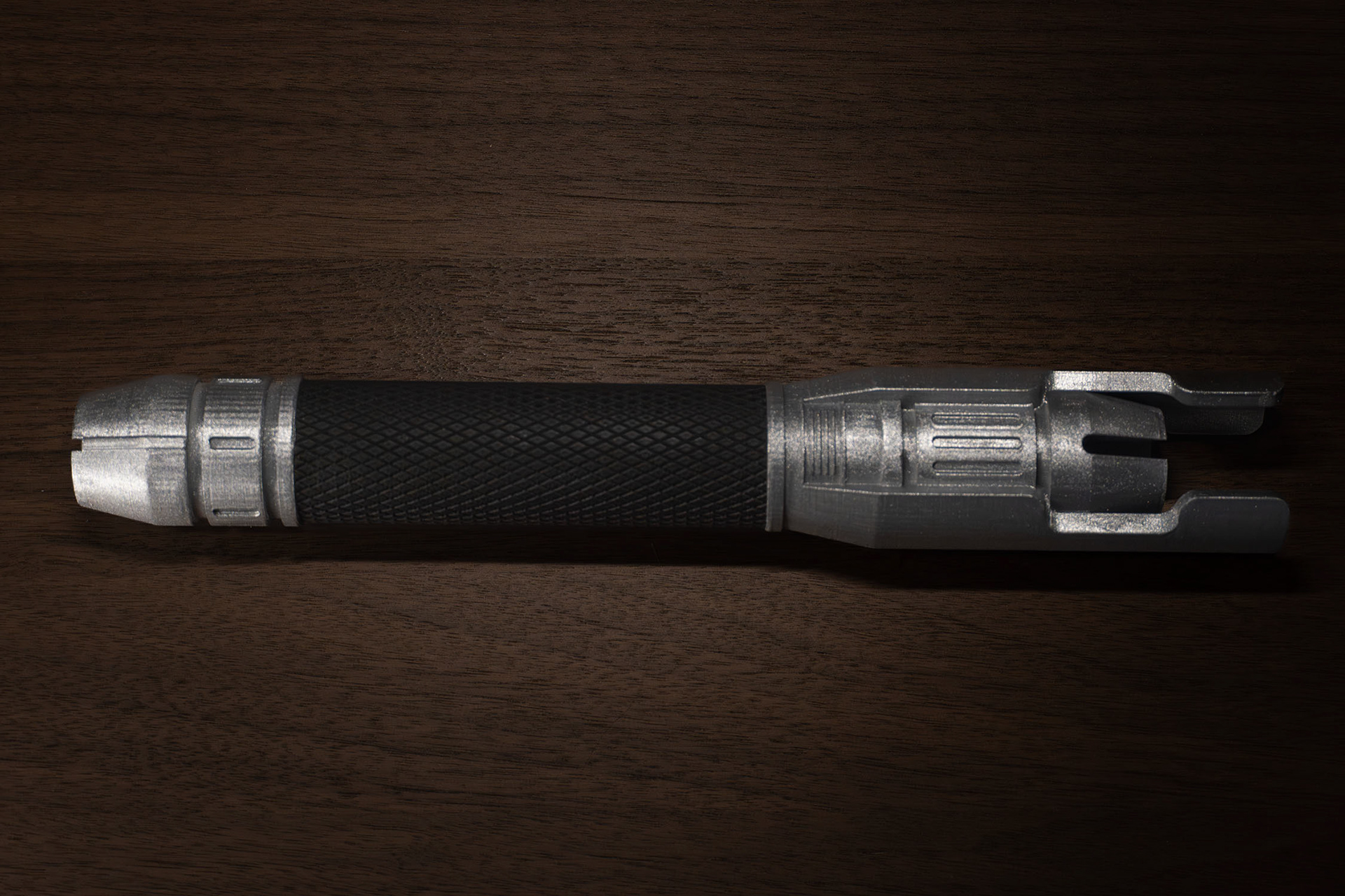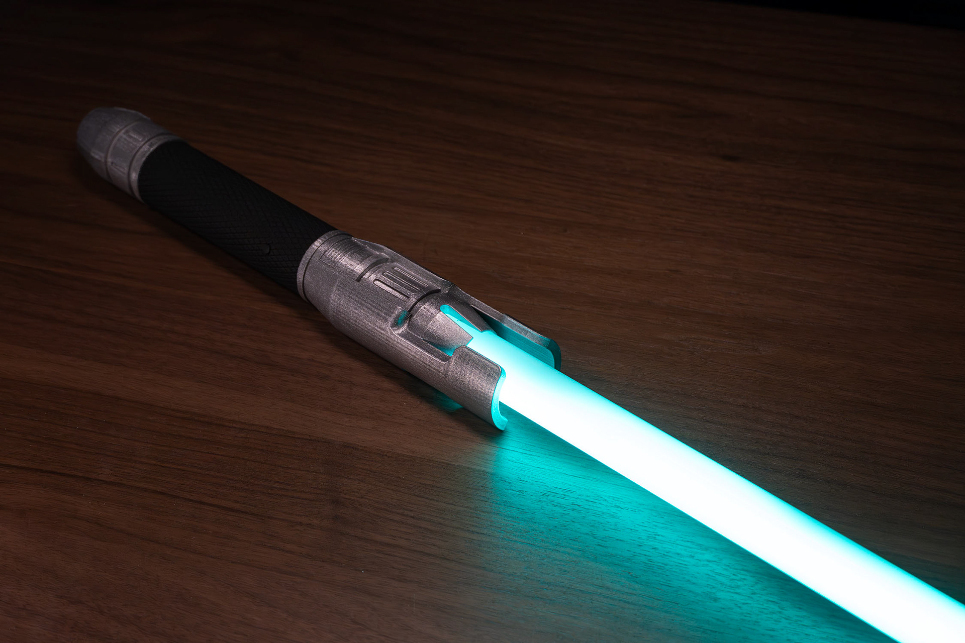 The hilt is printed in three parts, including the bottom cap, the handle, and the top blade holder. Designed in fusion, I used the thread tool to create internal and external threads so that the parts connect firmly with each other. Towards the base of the hilt is the battery, which connects the the Arduino Nano through a male to male USB A to USB C converter. A pushbutton glued inside of the grip can be plugged in to the Arduino along with both LED strips plugging in from the top. The blade is made up of a heavy blade from Ultra Sabers, with two LED strips inside and thin foam padding to diffuse the light. The paint used is matte black fro the grip, and a metallic silver for the rest.