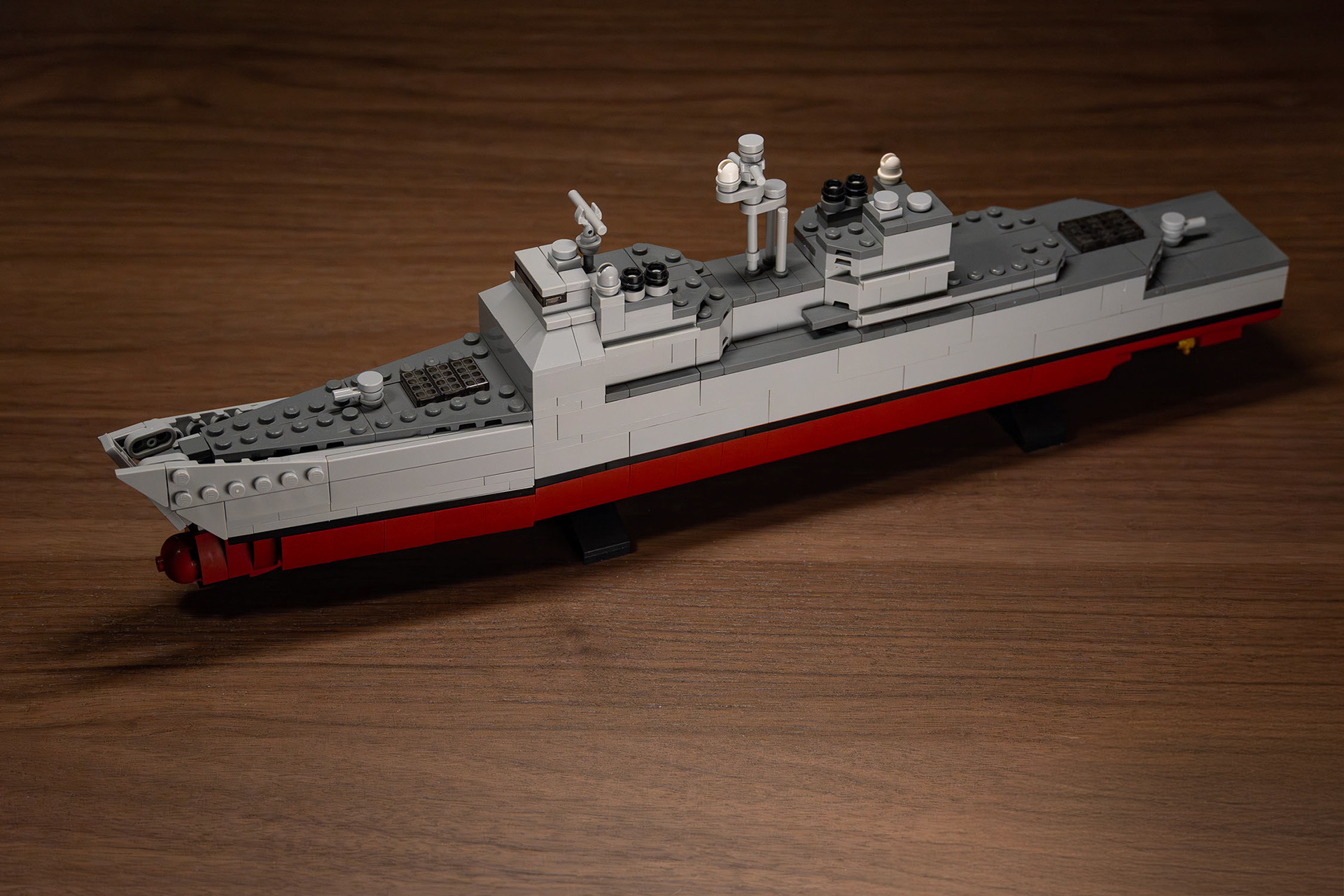 This model of the USS Normandy is much denser than the Gerald R. Ford, being made up of around 1000 pieces and measuring around 12 inches. It is slightly bigger than it should be compared to the Gerald R. Ford. It includes both MK 41 vertical launch systems and both 127 mm MK 48 Mod 4 canons.