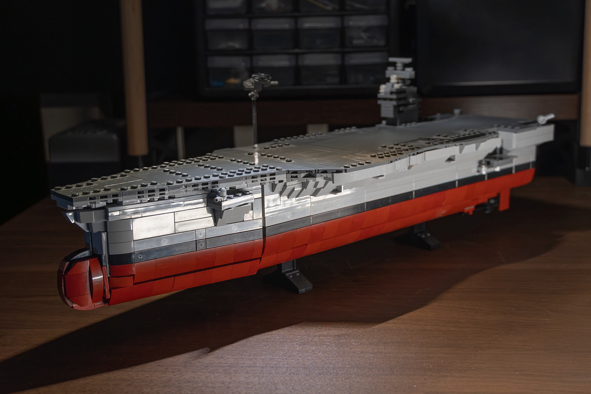 This is a model of the USS Gerald R. Ford which measures around 18 inches long and is comprised of about 1500 pieces. It includes all three elevators that can be moved up and down, one fewer than its predecessor, Nimitz-class carriers. Its three Phalanx CIWS can be seen, along with one guided missile launching system seen towards the stern. The model was not designed with a specific scale, but it is around 1:500, with some parts being slightly out of proportion.